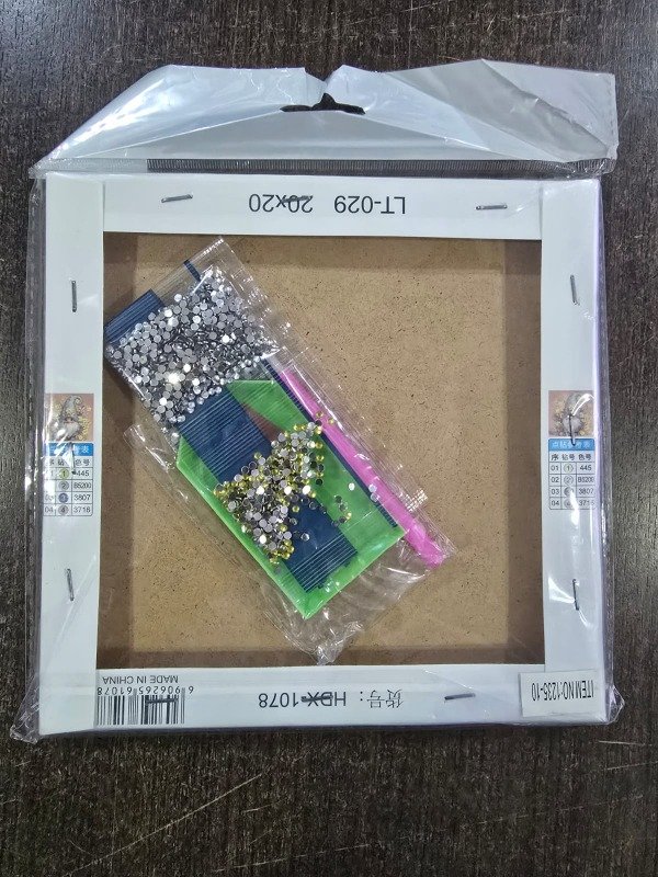 Lamina con parte del dibujo engomado, ya en bastidor de MADERA de 20x20, (es con diamantes en toda la imagen, 100% con diamantes).
